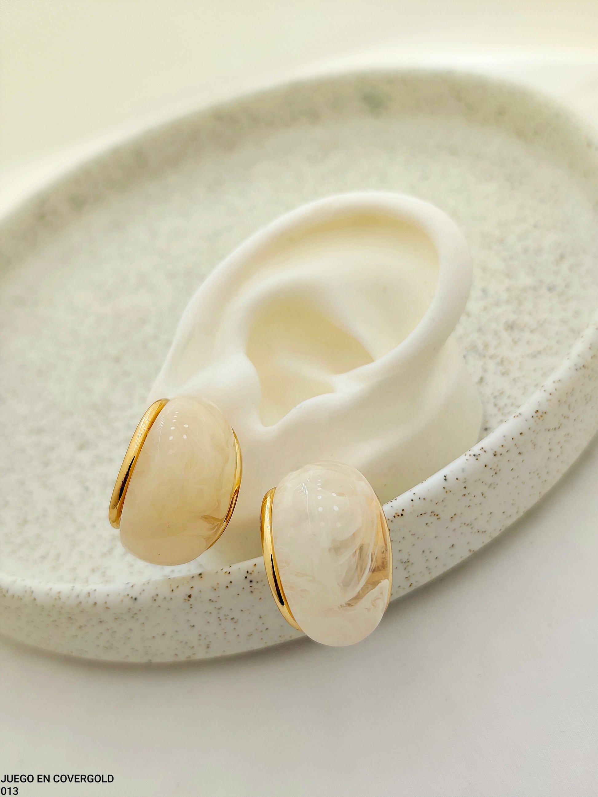 Aretes en covergold con efecto marmolado en tono crema, suaves y elegantes, ideales para un look delicado y luminoso ✨🤍💫