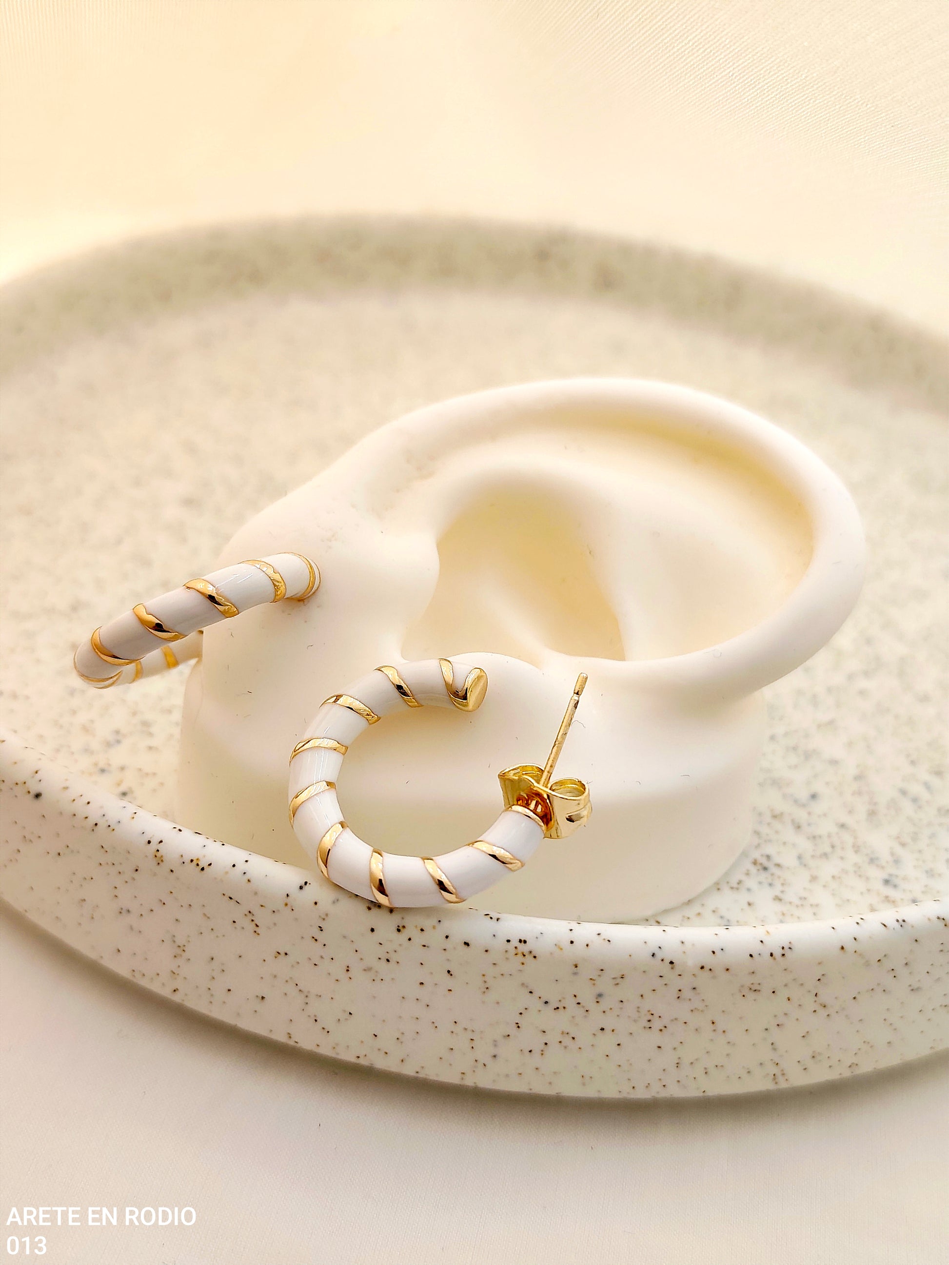 Arete en rodio blanco con delicadas líneas doradas, un diseño elegante y moderno que aporta contraste y brillo sutil para complementar cualquier estilo.