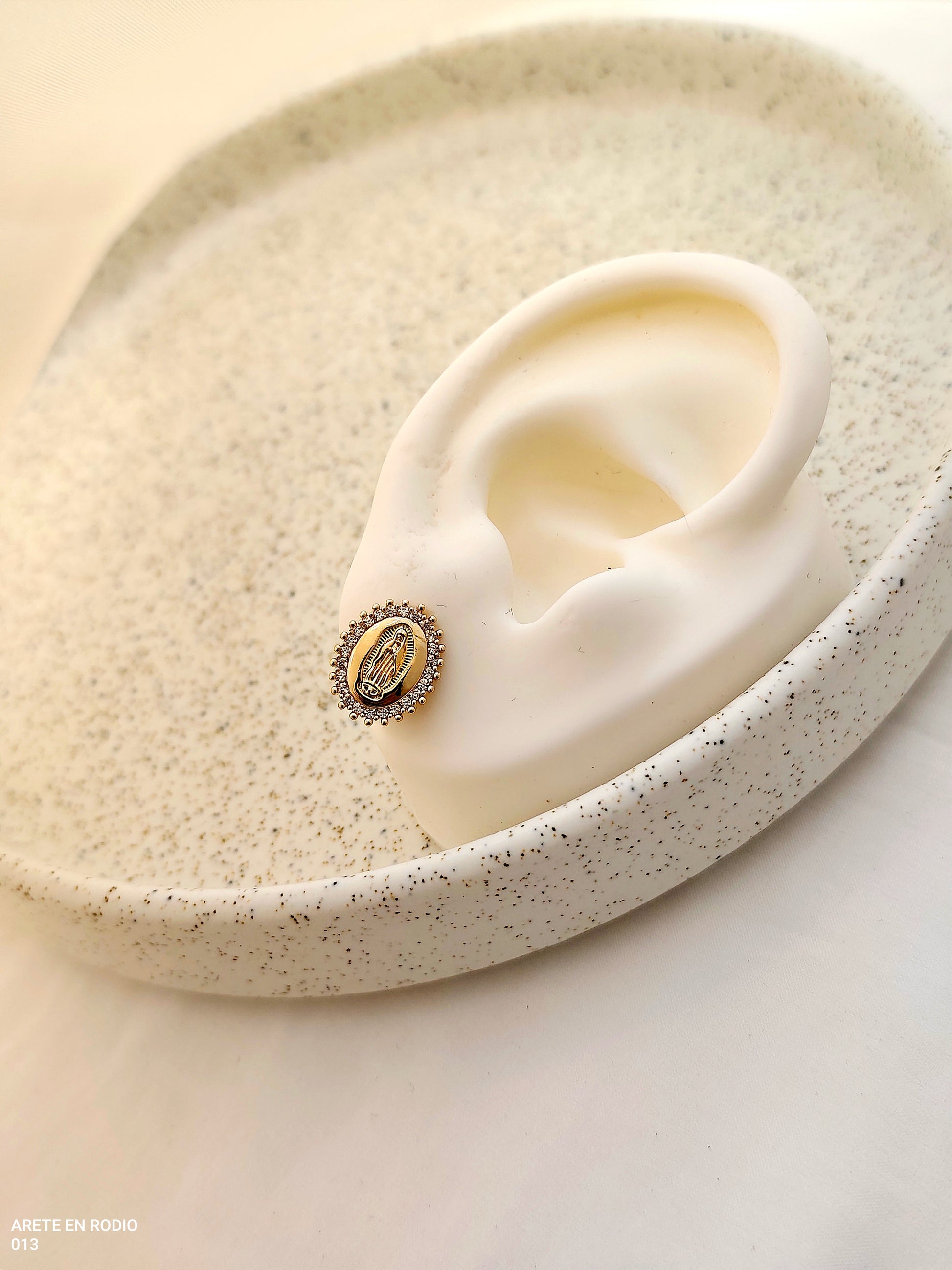 Arete en rodio con diseño de la Virgencita de Guadalupe, dorado y brillante, un accesorio delicado y lleno de significado, ideal para llevar con estilo y elegancia en cualquier ocasión.