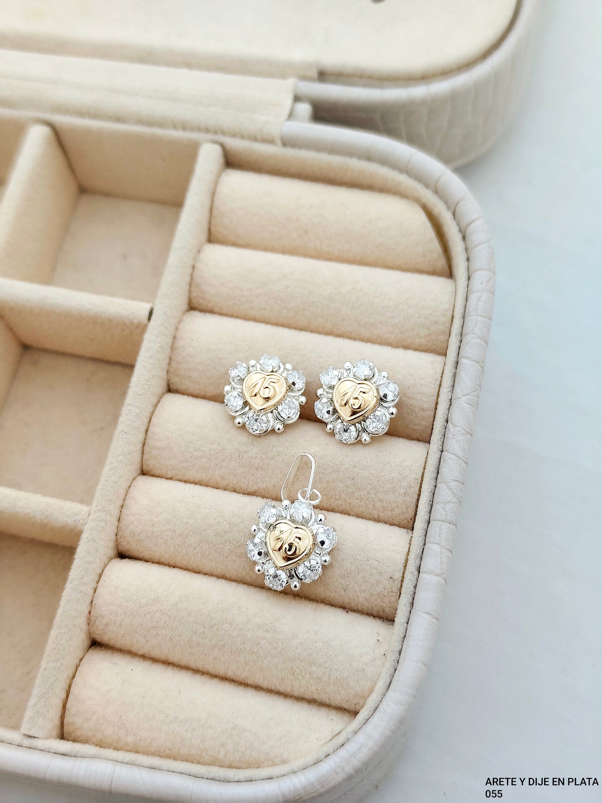 Juego en plata con dije y aretes en forma de corazón, rodeados de detalles brillantes y centro en tono dorado con grabado “15”. Un set delicado y especial, ideal para celebrar momentos importantes ✨💖
