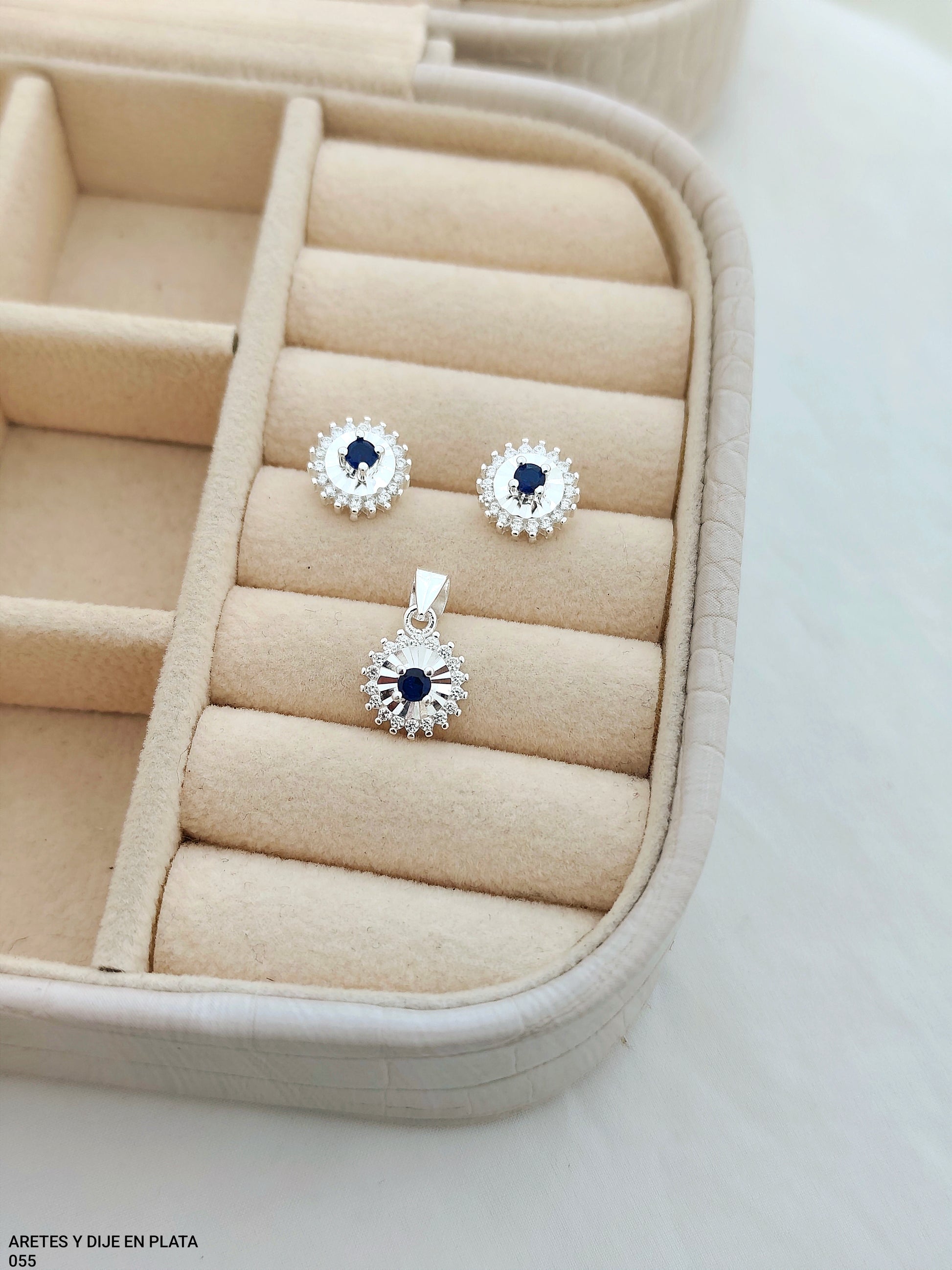 Aretes y dije en plata con diseño circular y detalle central en esmeralda azul. Un set delicado y elegante, ideal para el uso diario ✨💙