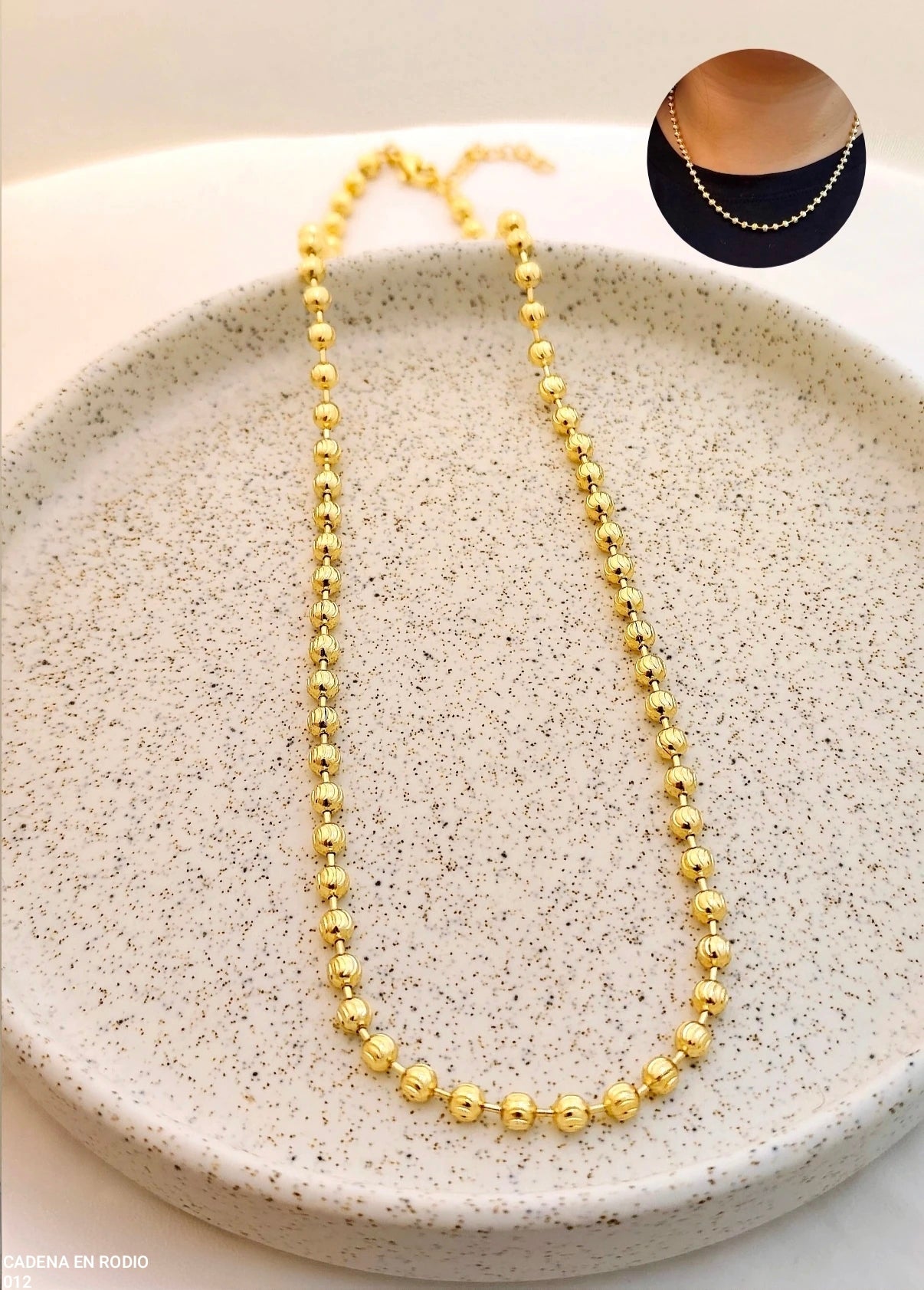 Cadena delicada con bolitas en rodio dorado, perfecta para un look minimalista y brillante. Ligera, elegante y ideal para usar sola o en capas. ✨