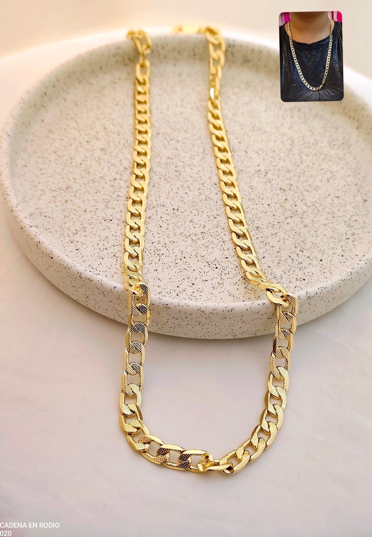 Cadena robusta con acabado en rodio dorado, diseñada para destacar por su brillo intenso y su presencia elegante. Un diseño sólido, moderno y atemporal, ideal para quienes buscan un accesorio con carácter y estilo. Perfecta para usar sola o combinar con dijes.