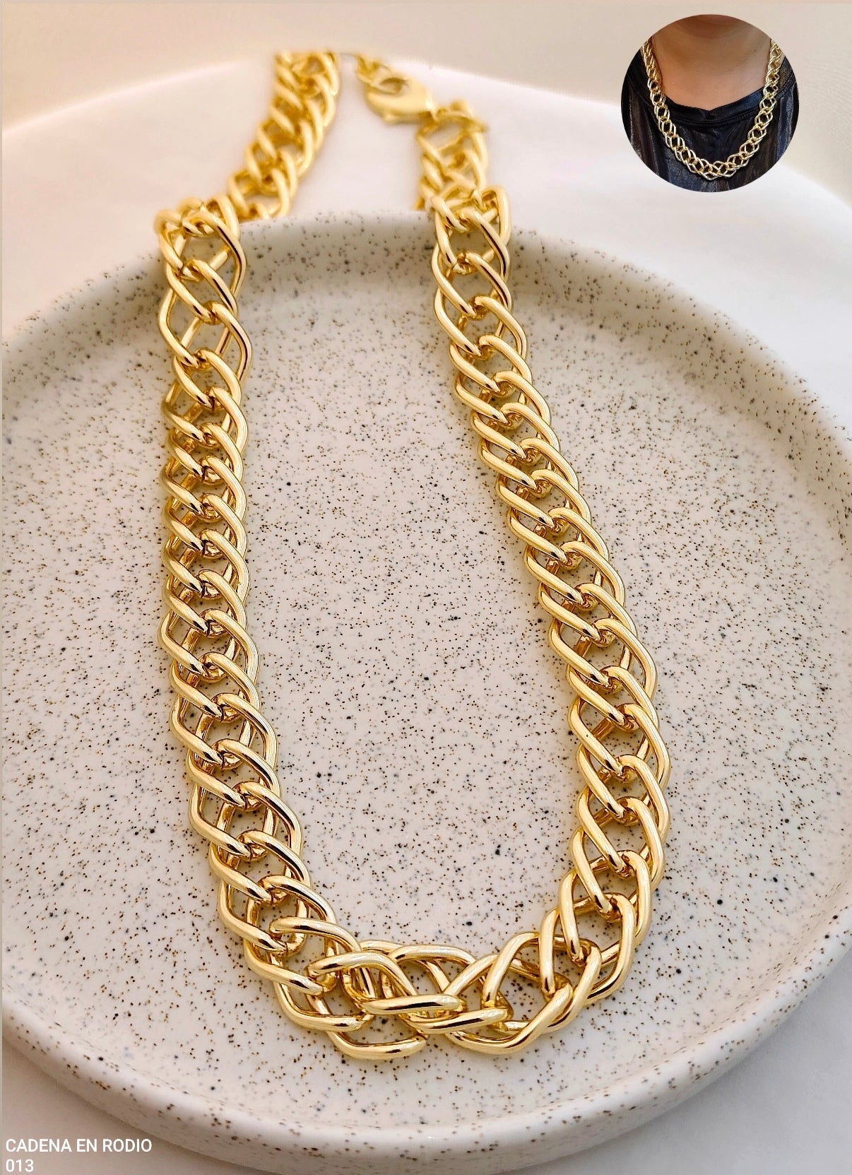 Cadena gruesa con acabado en rodio dorado, diseñada para ser el centro de atención. Su tejido trenzado crea un volumen elegante y moderno que aporta carácter a cualquier look. Una pieza con personalidad propia, ideal para usar sola y destacar por su brillo intenso y acabado premium.