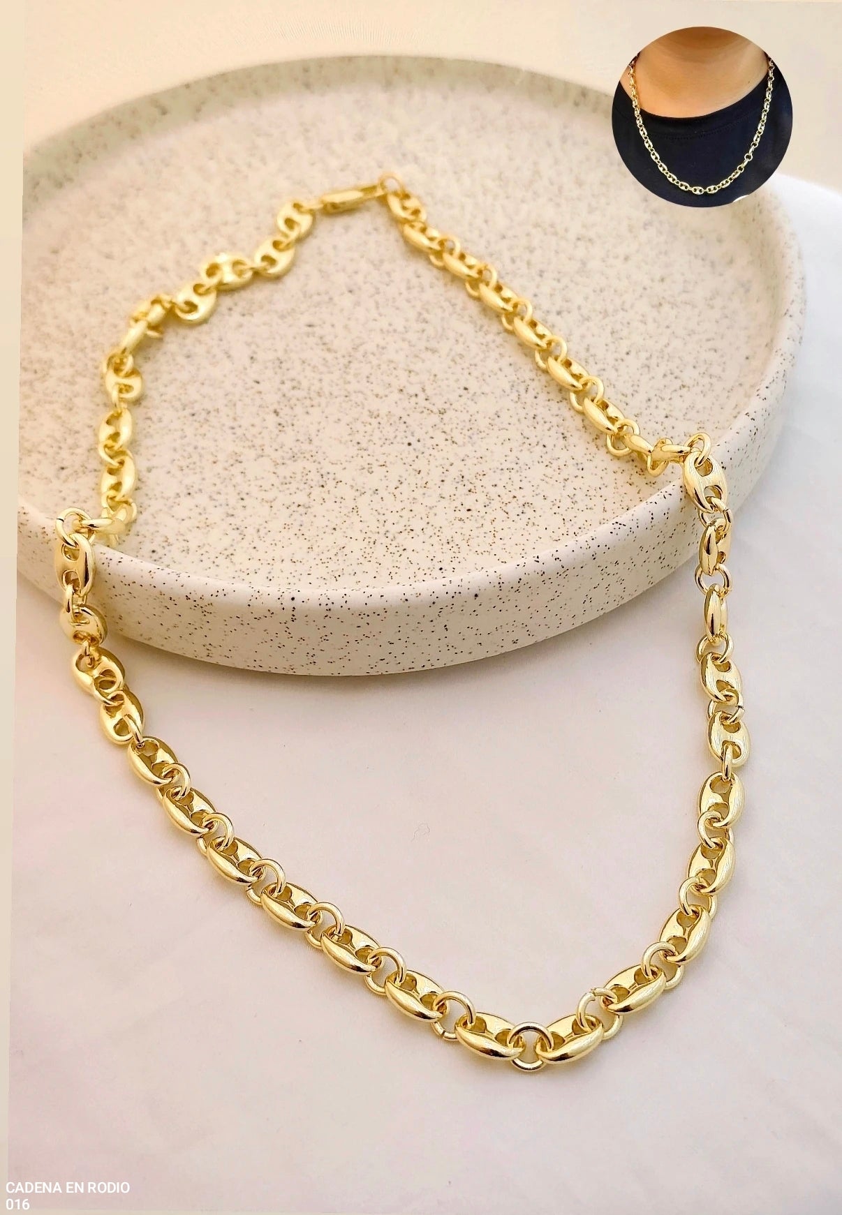 Cadena gruesa con diseño tipo Gucci y acabado en rodio dorado. Brillo intenso y presencia elegante, ideal para lucir sola y destacar tu estilo. ✨
