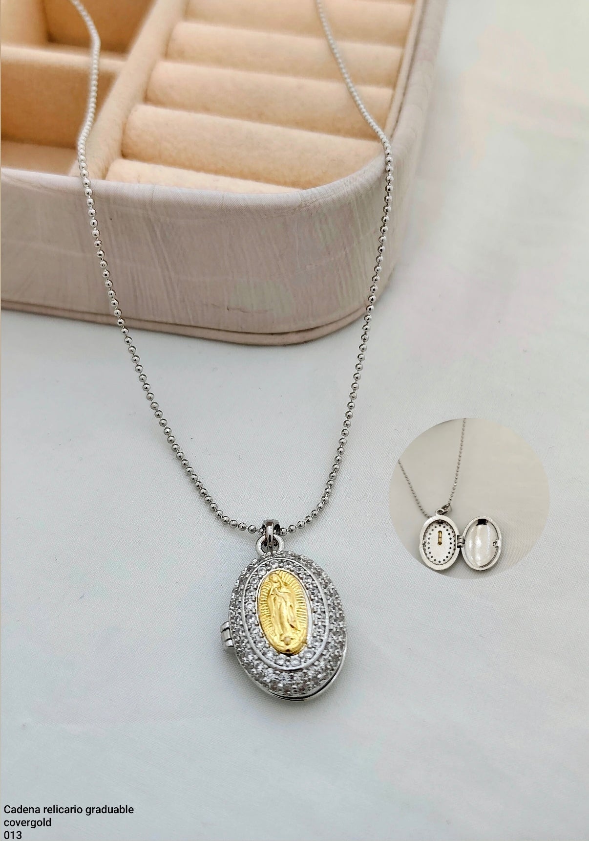 Cadena relicario graduable en covergold con dije de virgencita. Delicada, brillante y perfecta para usar a diario o como detalle especial.
