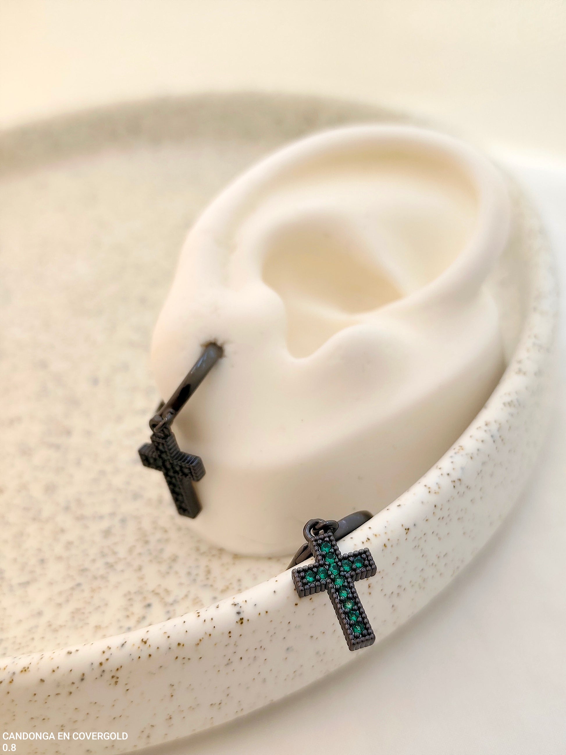 Cruz negra colgante con brillantes verdes. Detalle moderno y llamativo.
