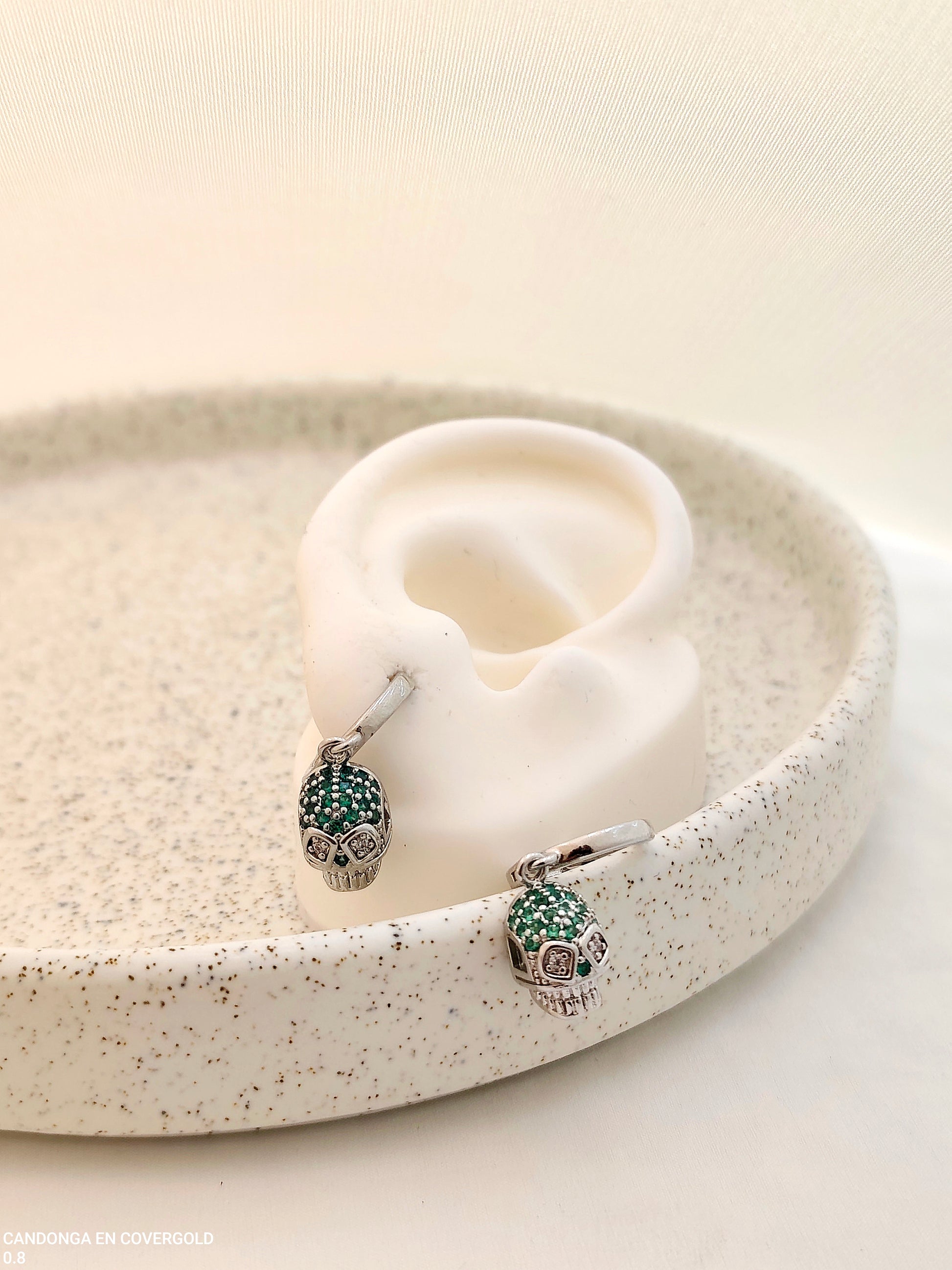 Candonga plateada en covergold con pequeña calavera colgante en brillos verdes. Diseño moderno y llamativo.