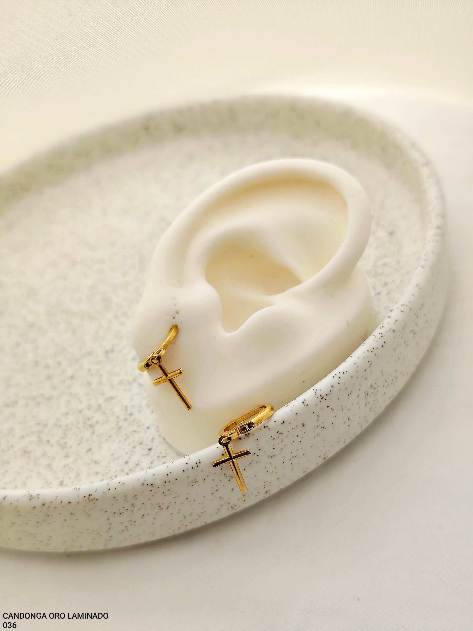 Candonga pequeña en oro laminado con una cruz delicada colgante, diseño elegante y sutil, ideal para uso diario y fácil de combinar ✨