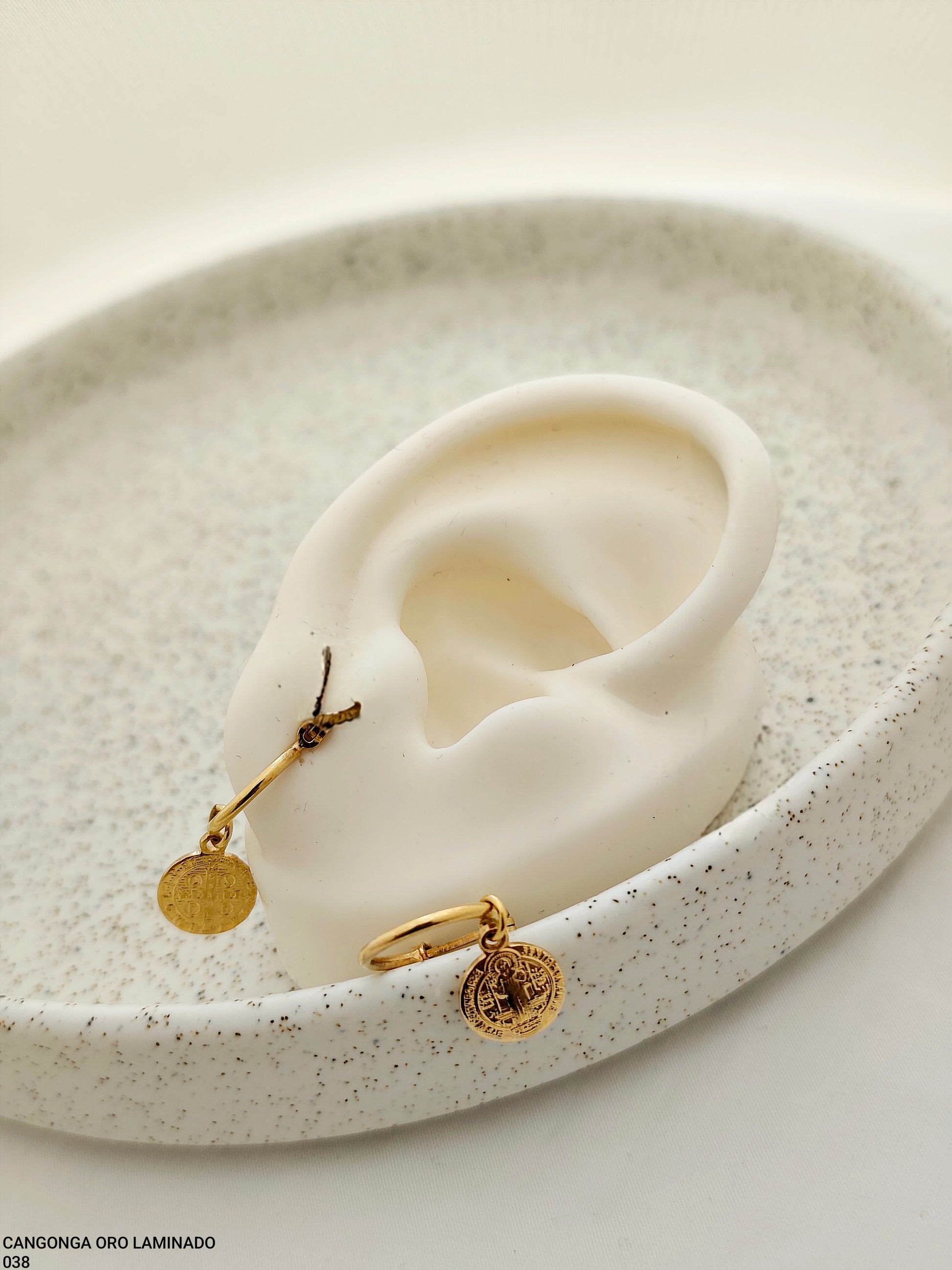 Candonga pequeña en oro laminado con dijecito de San Benito colgante, diseño delicado y discreto, ideal para uso diario y fácil de combinar ✨