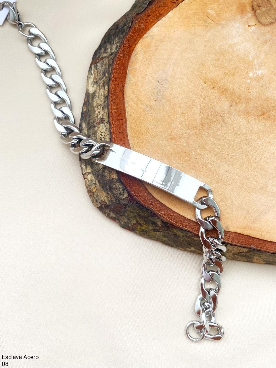 Llévate esta elegante esclava de acero plateado que complementará tu estilo con su toque de sofisticación. Hecha con materiales de alta calidad, esta pieza es perfecta para realzar cualquier atuendo.