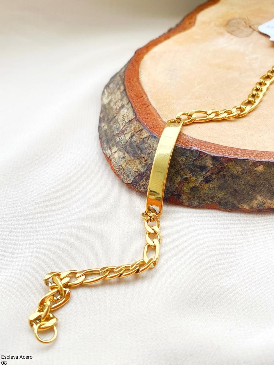 Luce elegante y sofisticado con nuestra Esclava en Acero dorado. Hecha de acero de alta calidad, esta pulsera es el complemento perfecto para cualquier atuendo. Siente la exclusividad de llevar una pieza de arte en tu muñeca.