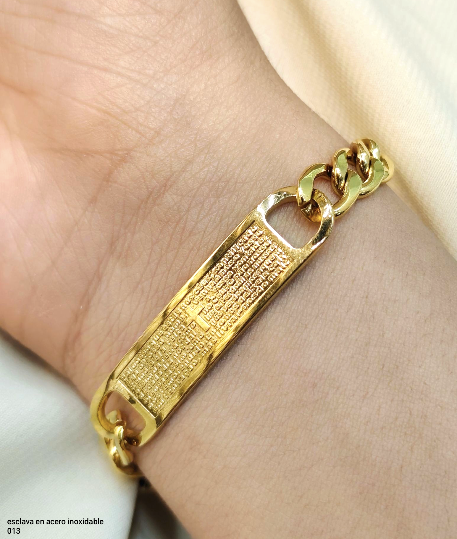 Pulsera tipo esclava en acero inoxidable, grabada con el Padre Nuestro en portugués. Resistente, elegante y con un diseño que combina fe y estilo en una sola pieza. Ideal para uso diario o como regalo especial.