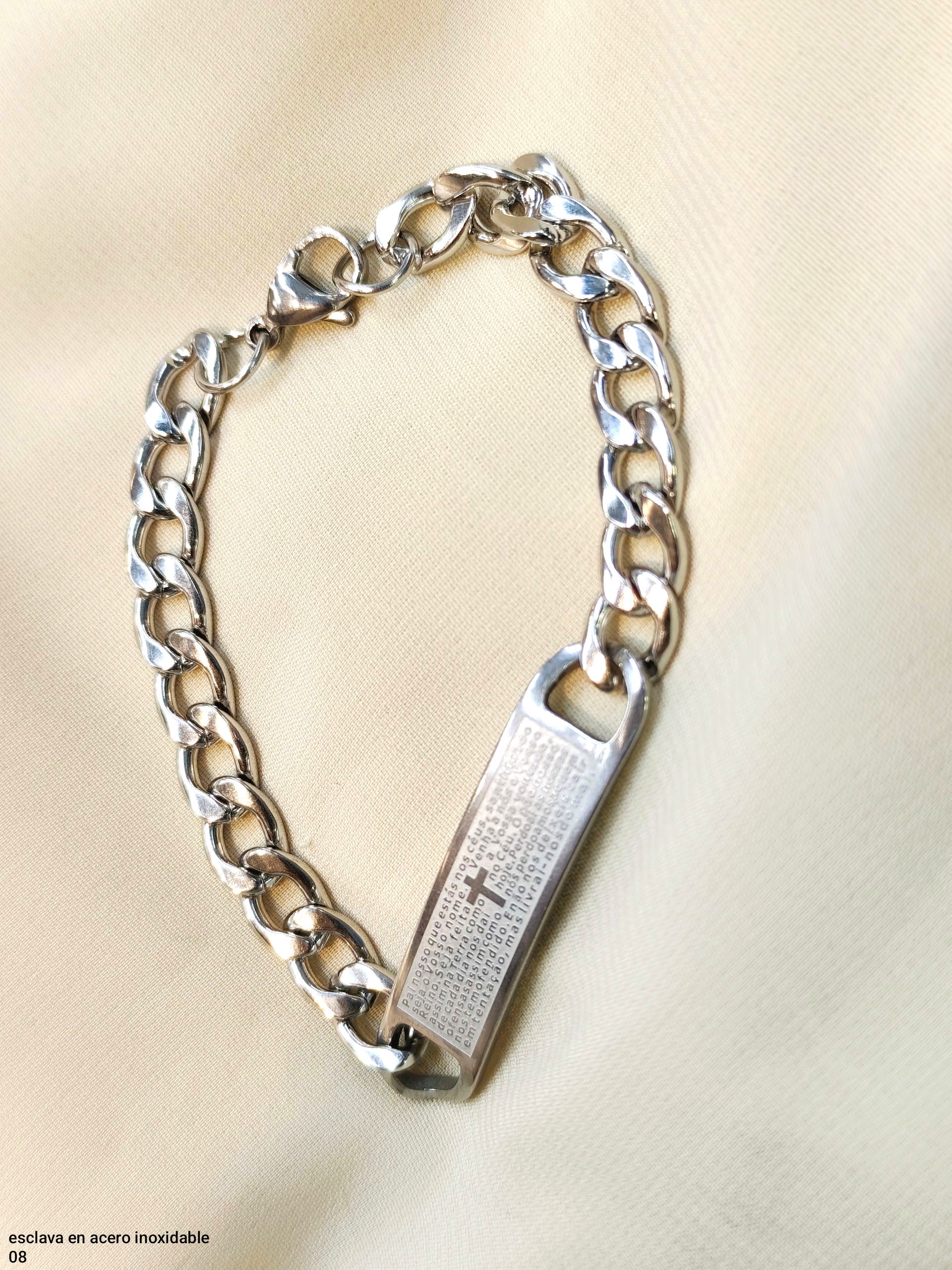 Pulsera tipo esclava en acero inoxidable, grabada con el Padre Nuestro en portugués. Resistente, elegante y con un diseño que combina fe y estilo en una sola pieza. Ideal para uso diario o como regalo especial.