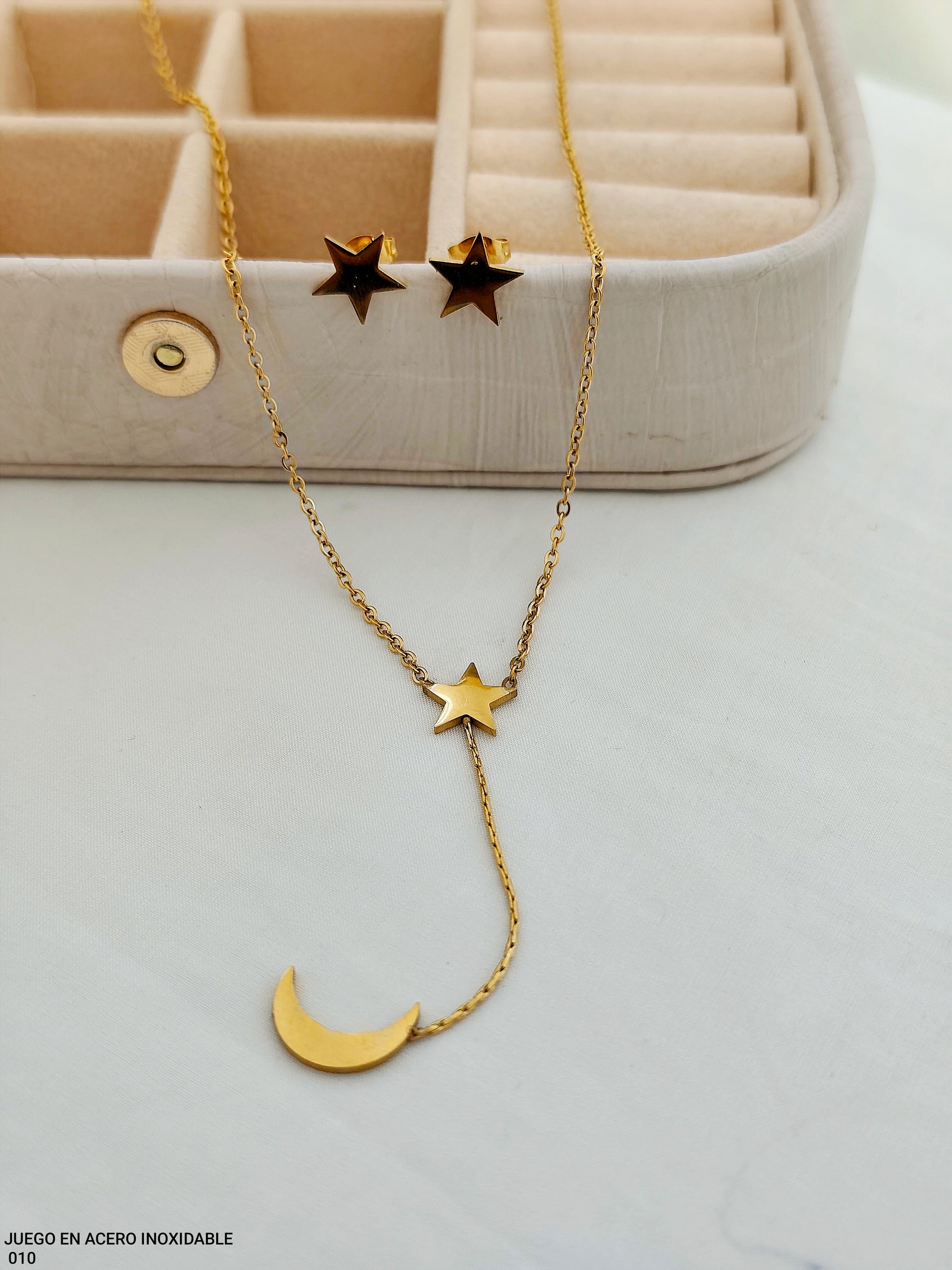 Juego en acero inoxidable dorado compuesto por collar de cadena delicada con diseño de estrella y luna colgante, acompañado de topos en forma de estrella, ideal para aportar un toque místico, moderno y elegante a cualquier look