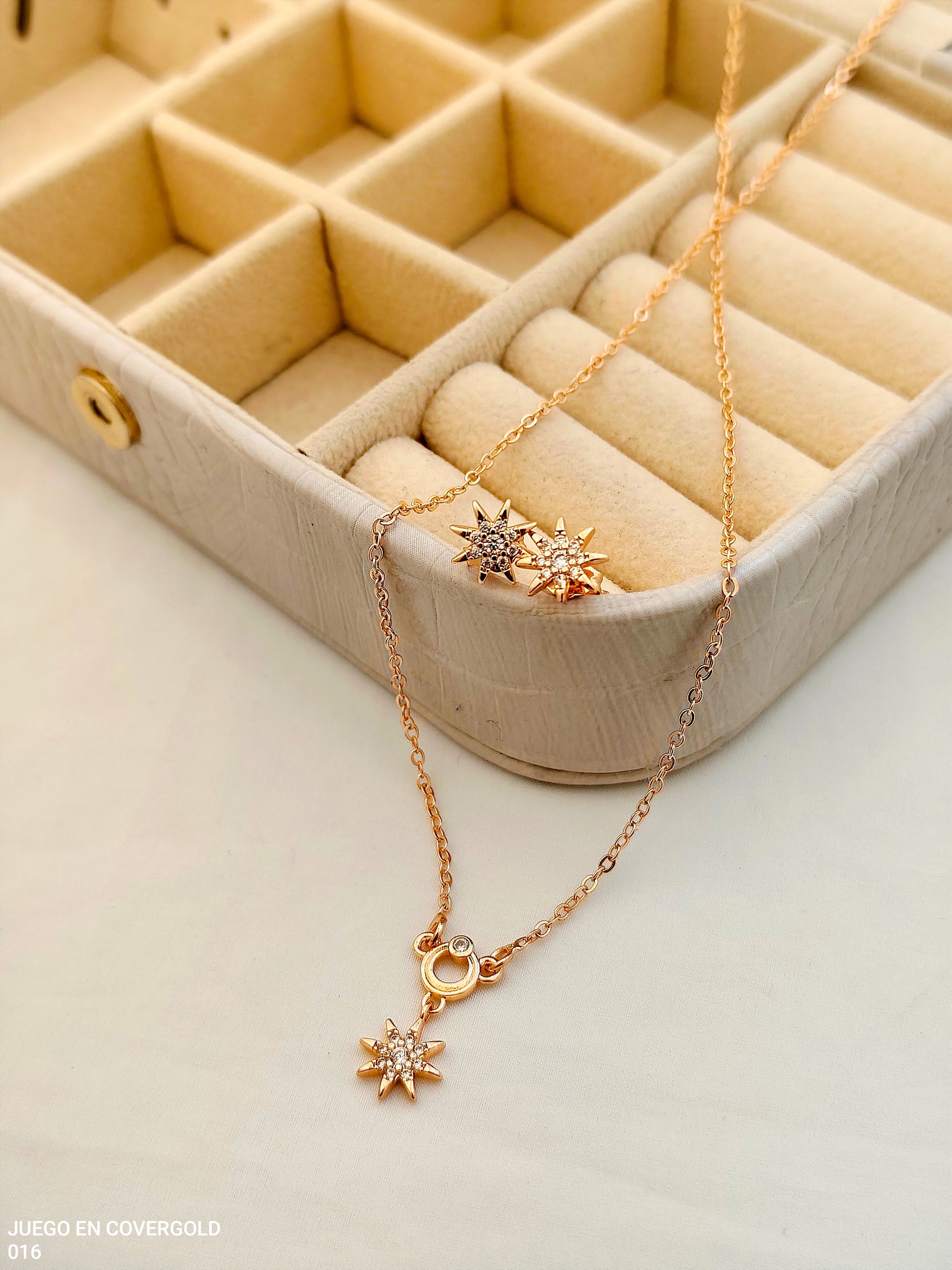 Juego en covergold pegado con diseño de solecito, delicado y luminoso, perfecto para aportar un toque cálido y radiante a tu look diario. ✨🌞