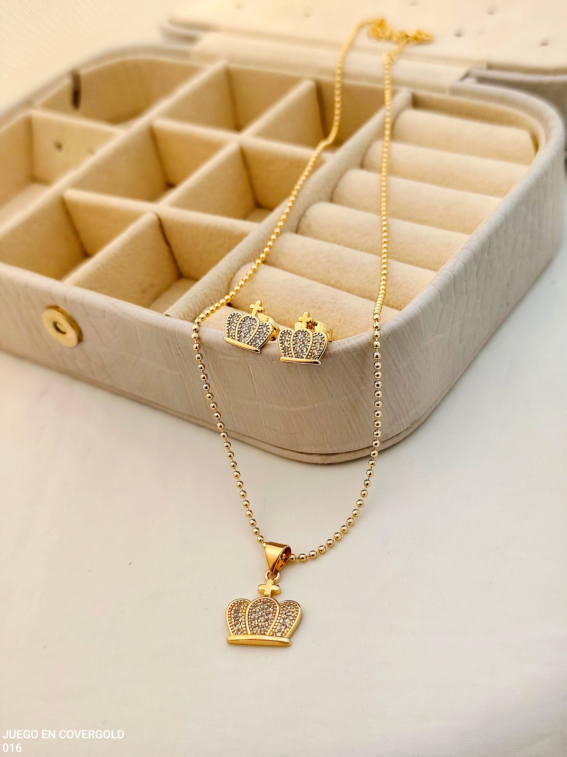 Juego en covergold pegado con diseño de corona, elegante y delicado, ideal para añadir un toque sofisticado y real a tu look diario. ✨👑