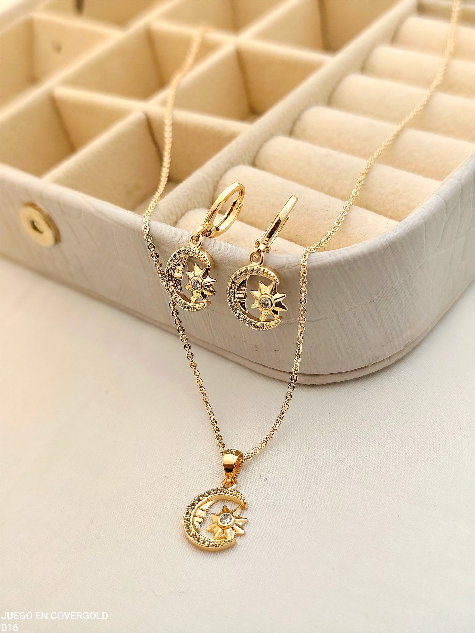 Juego en covergold pegado con diseño de luna y una estrella al centro, delicado y celestial, perfecto para añadir un toque mágico y elegante a tu look diario. ✨🌙⭐