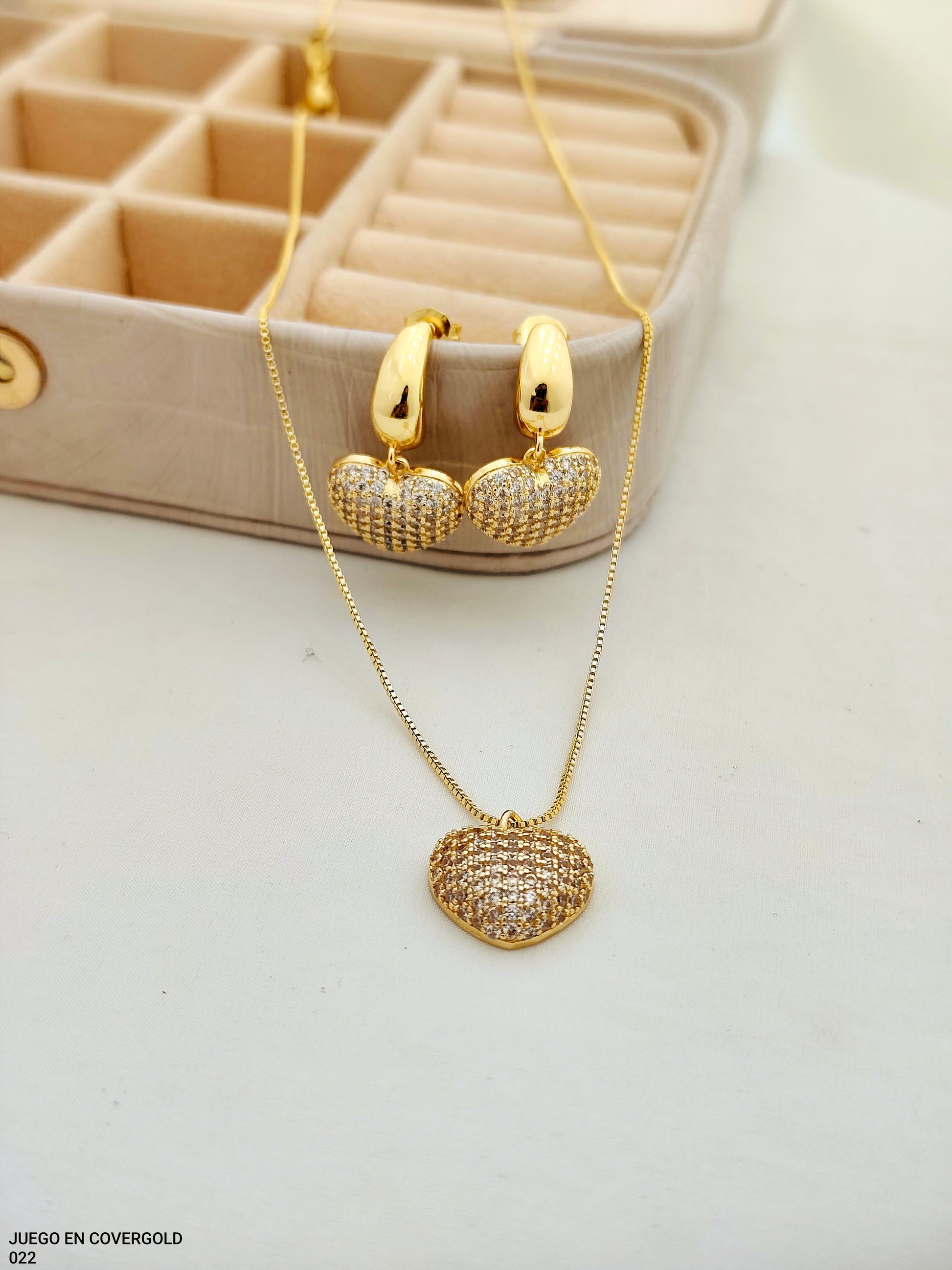 Juego en covergold con aretes de corazón y cadena con dije de corazón dorado. Un set delicado y perfecto para regalar o lucir a diario.