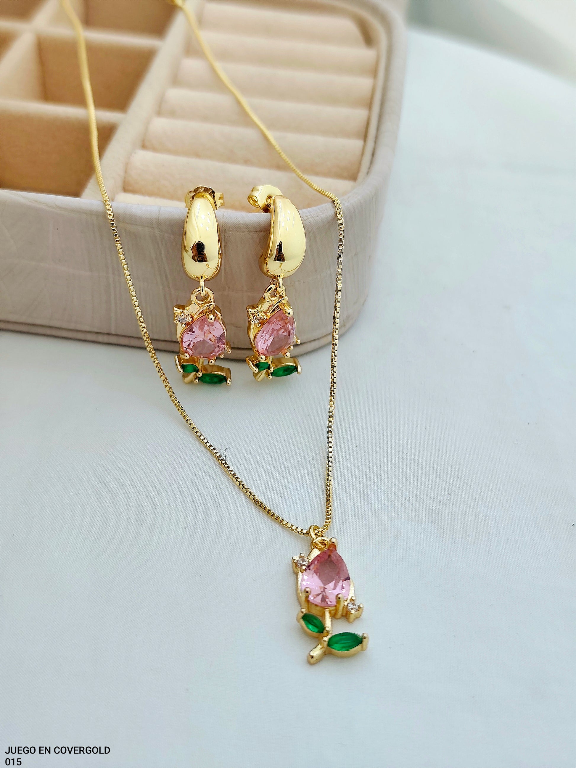 Juego en covergold con una delicada flor rosada, detallada con hojitas verdes y un toque de brillo tipo esmeralda que la hace ver encantadora y muy femenina ✨🌸💚 Ideal para quienes aman los accesorios sutiles pero llenos de luz.