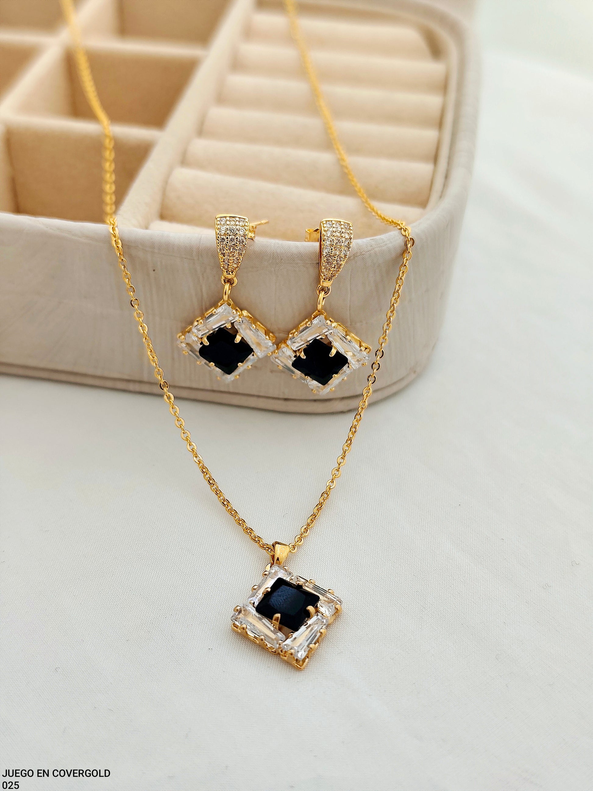 Juego en covergold compuesto por collar y aretes, con diseño geométrico elegante que combina una piedra central negra en corte cuadrado, rodeada de finos cristales que realzan su brillo y sofisticación ✨ Su acabado dorado aporta un estilo moderno y versátil, ideal para ocasiones especiales o para elevar cualquier look con un toque de lujo sutil 💛