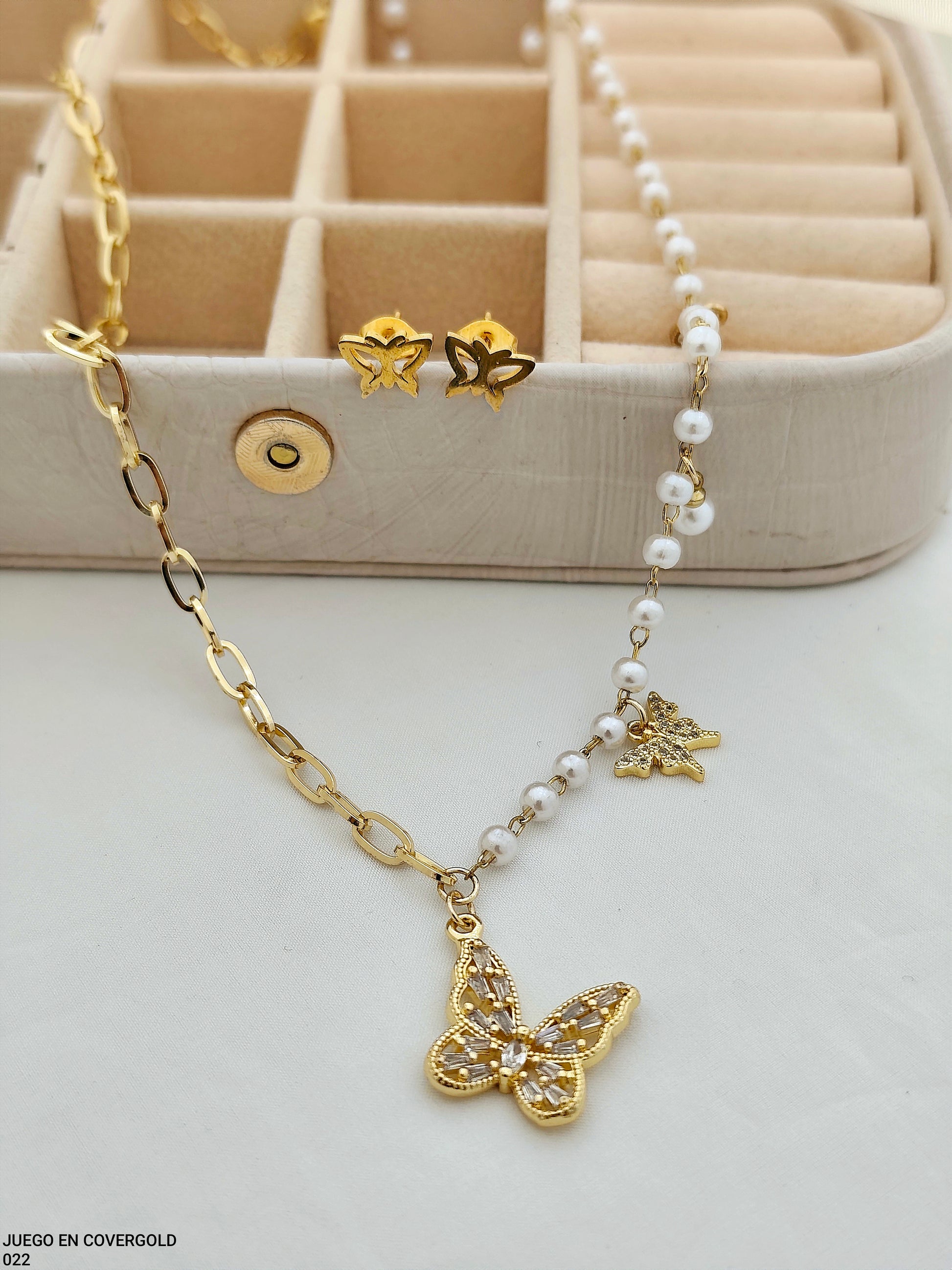 Juego de collar y aretes en CoverGold, con diseño delicado de mariposa adornada con brillantes y combinación de cadena clásica con detalle de perlas que aporta un estilo femenino y sofisticado ✨ Ideal para realzar looks elegantes o dar un toque especial al día a día, con acabado dorado brillante y excelente presentación 🦋💛