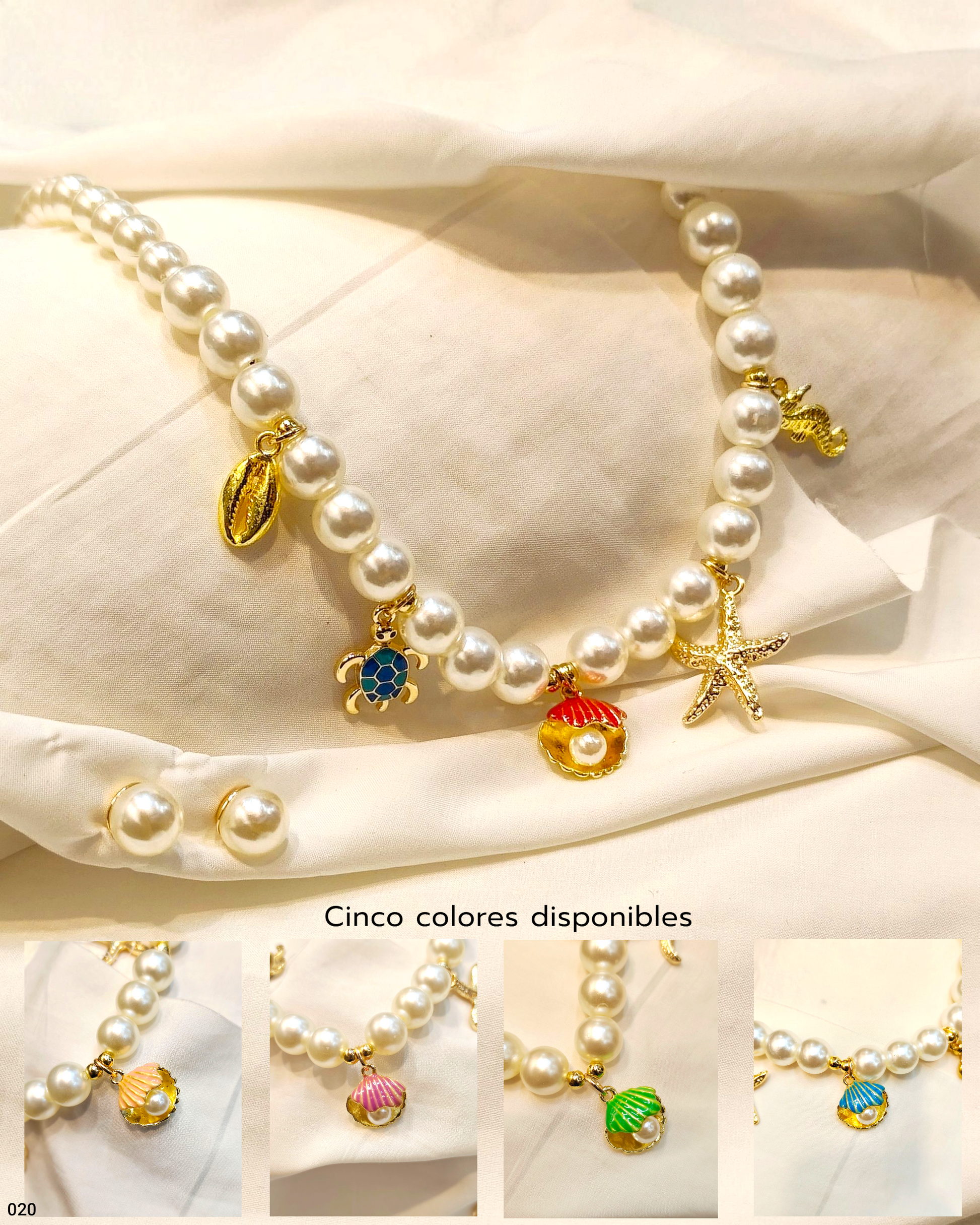 Collar con charms de inspiración marina que evocan frescura, libertad y verano, acompañado de topos delicados para completar el look. Un diseño versátil y con mucha personalidad.