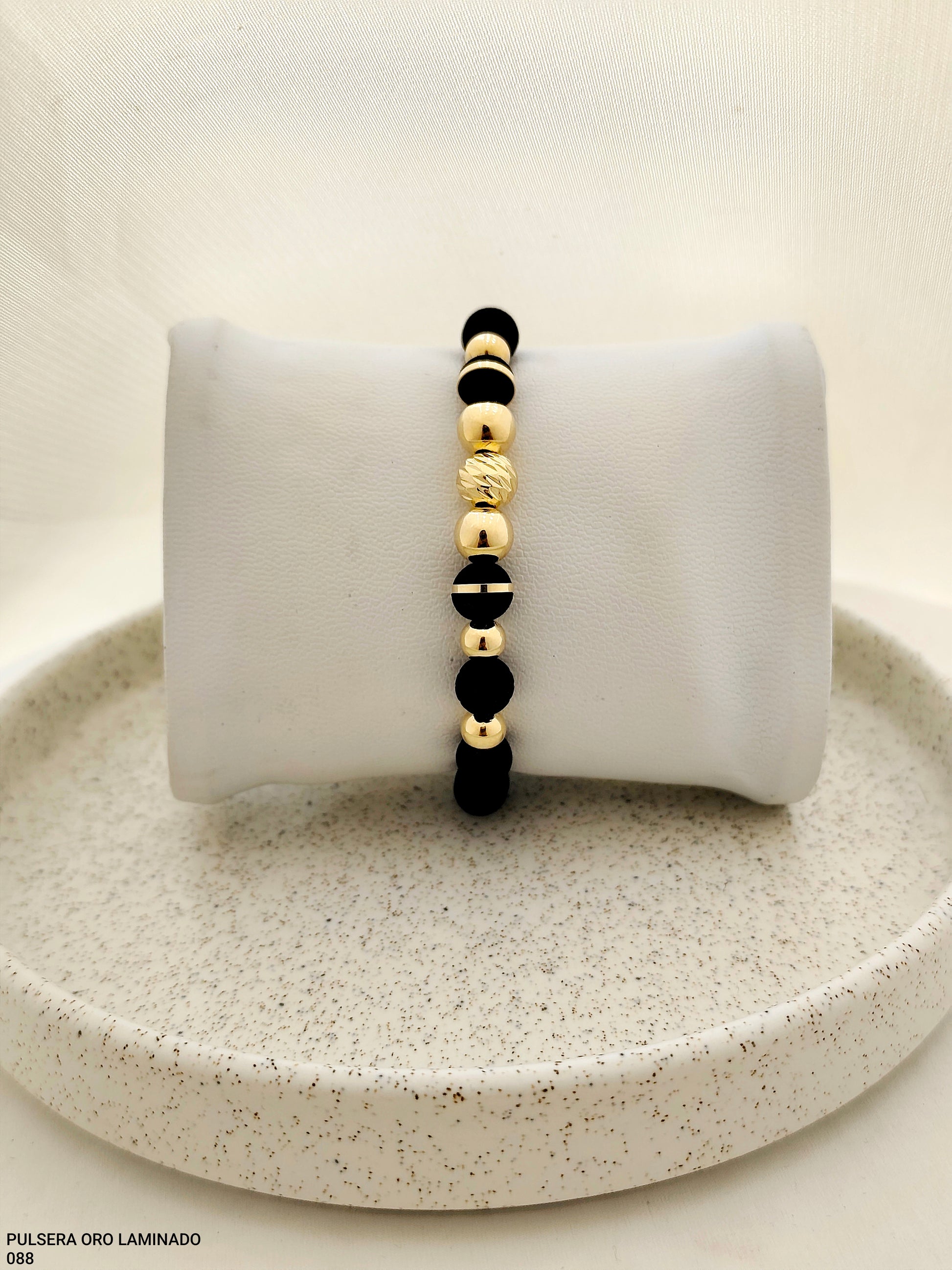 Pulsera en oro laminado con esferas negras de acabado mate y detalles dorados, diseño moderno y elegante, fácil de combinar, cómoda para uso diario y una excelente opción para regalo ✨🖤