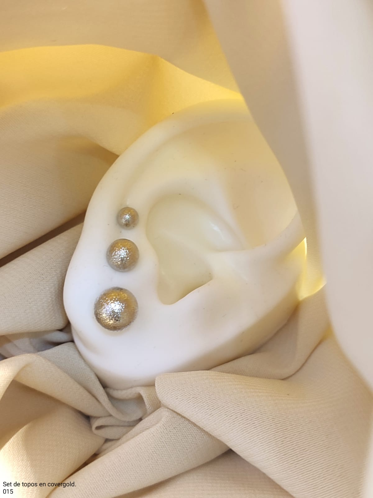 Elegante set de topos en acabado Covergold. Diseños versátiles y delicados, perfectos para usar todos los días o combinar en múltiples perforaciones. Ideal para agregar un toque de brillo sutil a tu estilo.