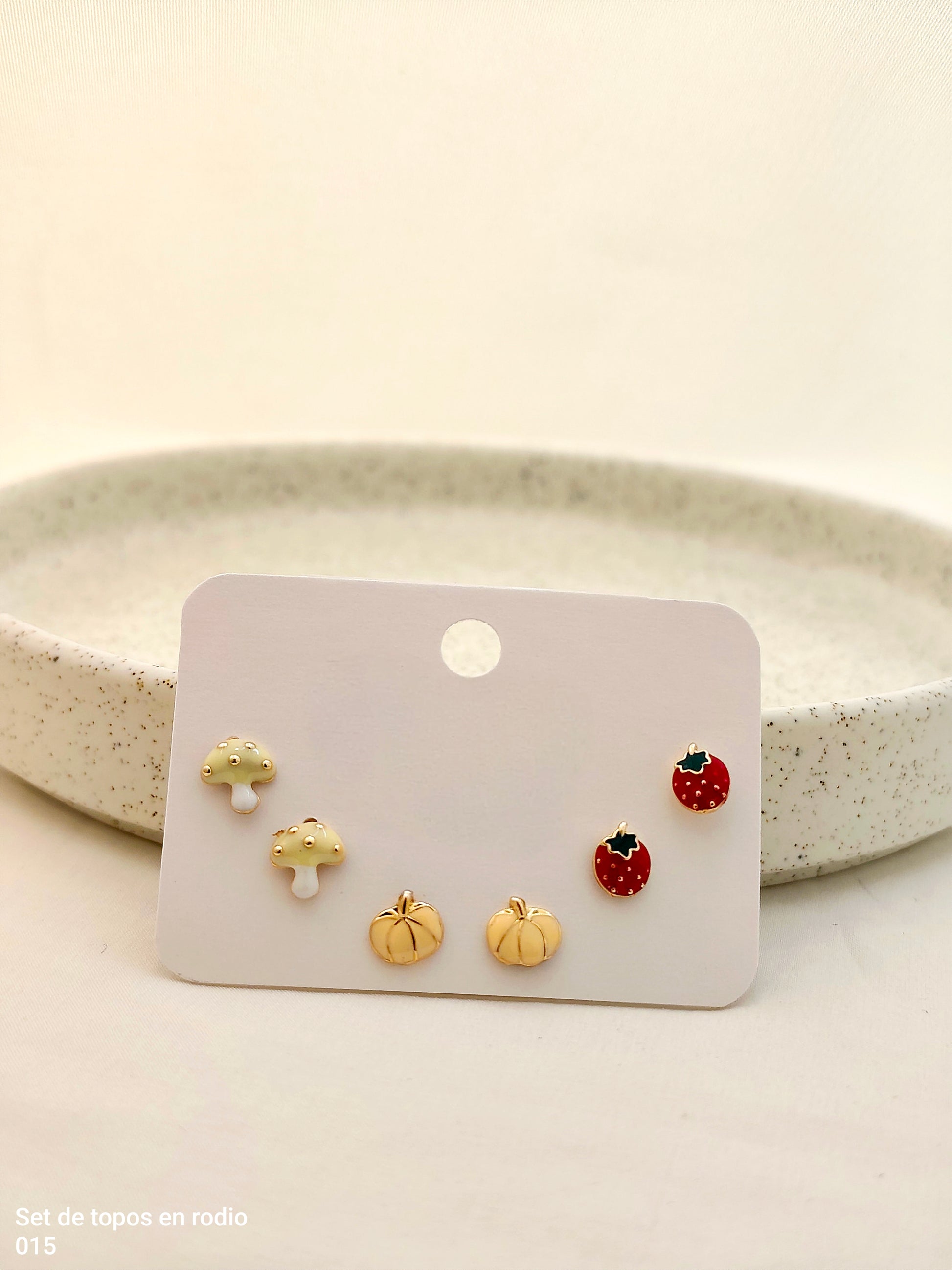 Set de topos en rodio con diseños de calabaza, fresas y honguitos, una propuesta divertida y colorida que aporta un toque único y creativo a cualquier look, ideal para quienes aman los accesorios con personalidad.