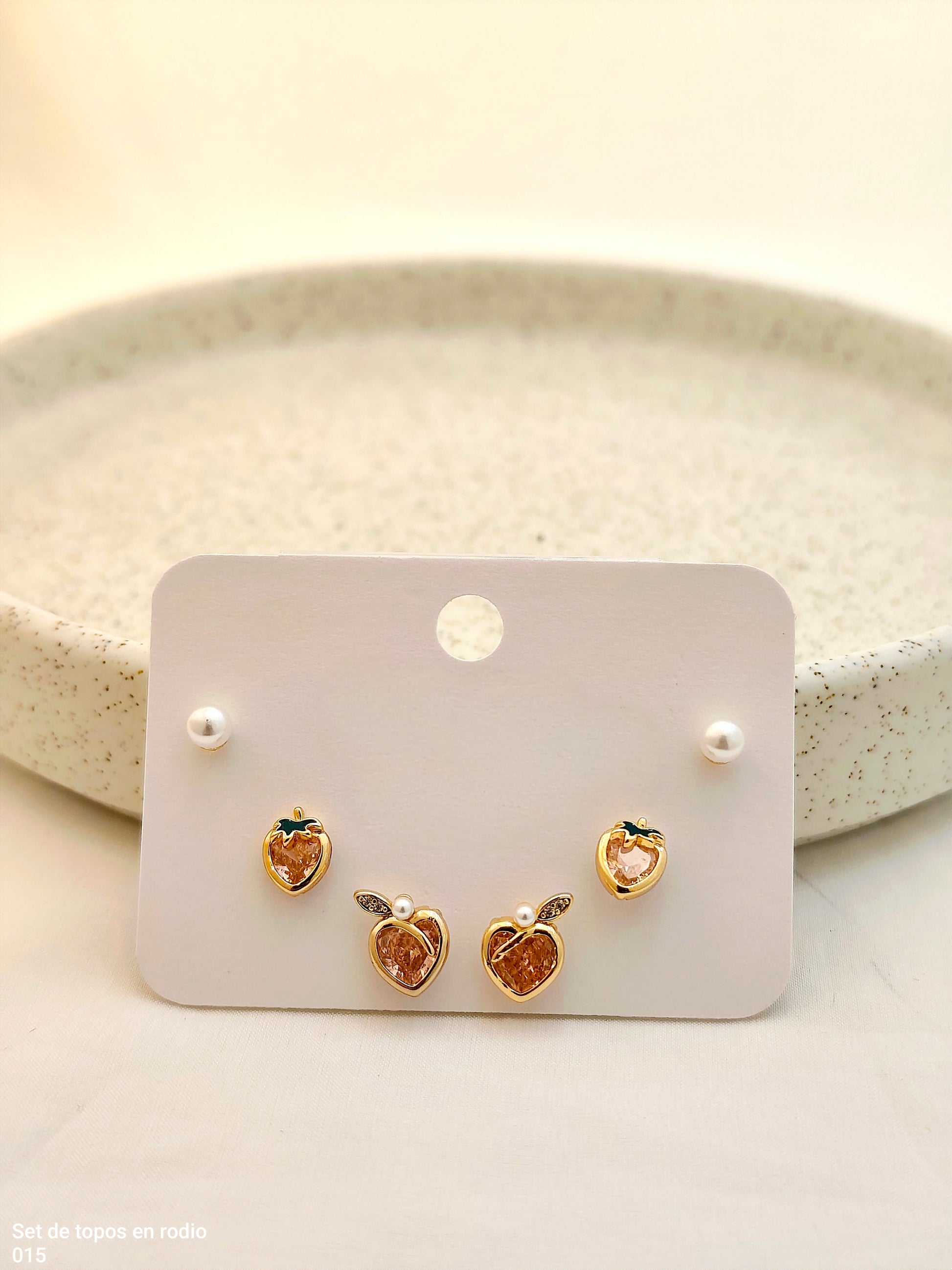 Set de topos en rodio con diseños de fresa, manzana y perlas. Dulces, modernos y perfectos para elevar cualquier outfit.