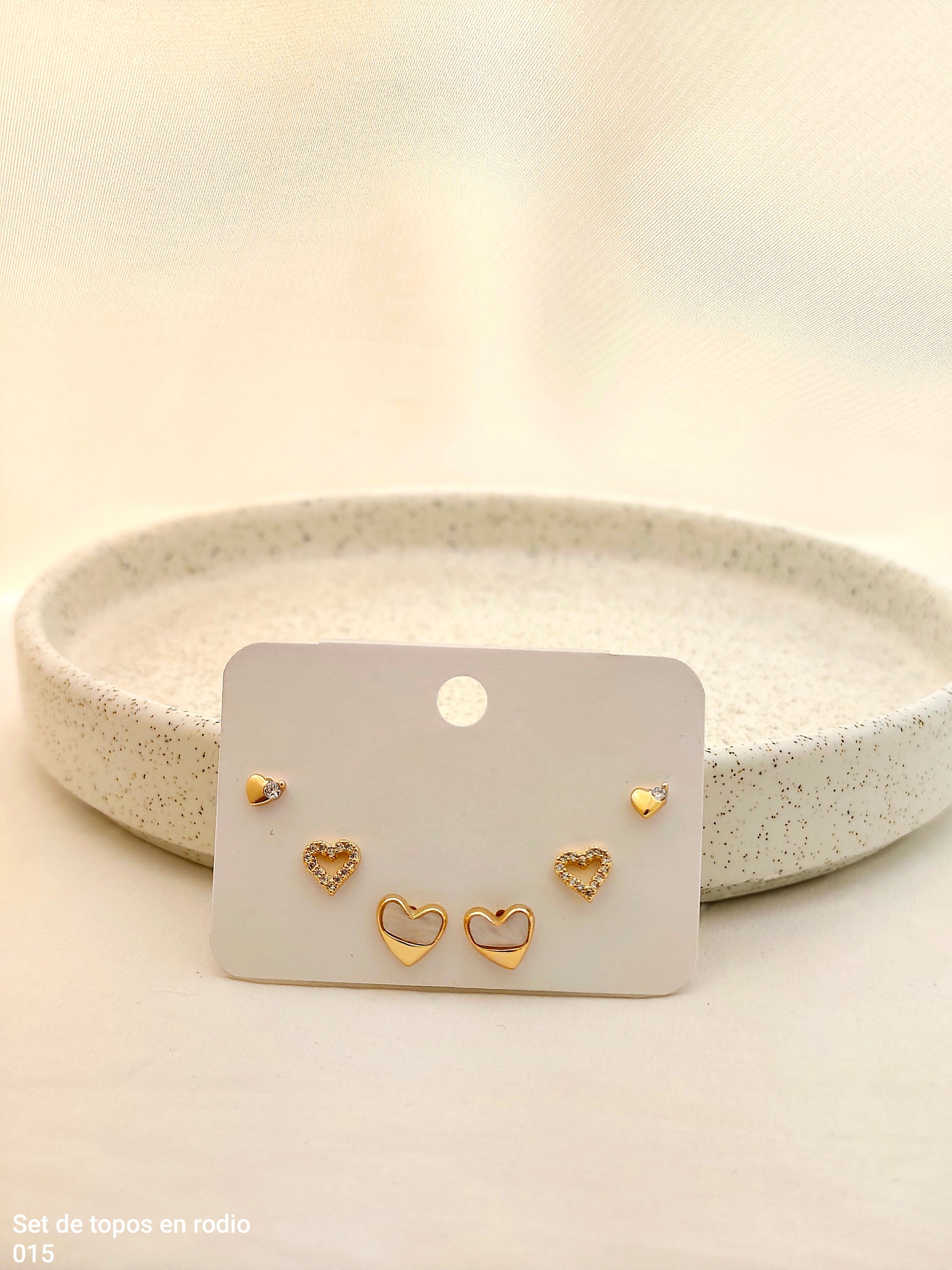 Set de topos en rodio con corazones dorados y brillos. Delicados, versátiles y perfectos para sumar luz a tu look. ✨