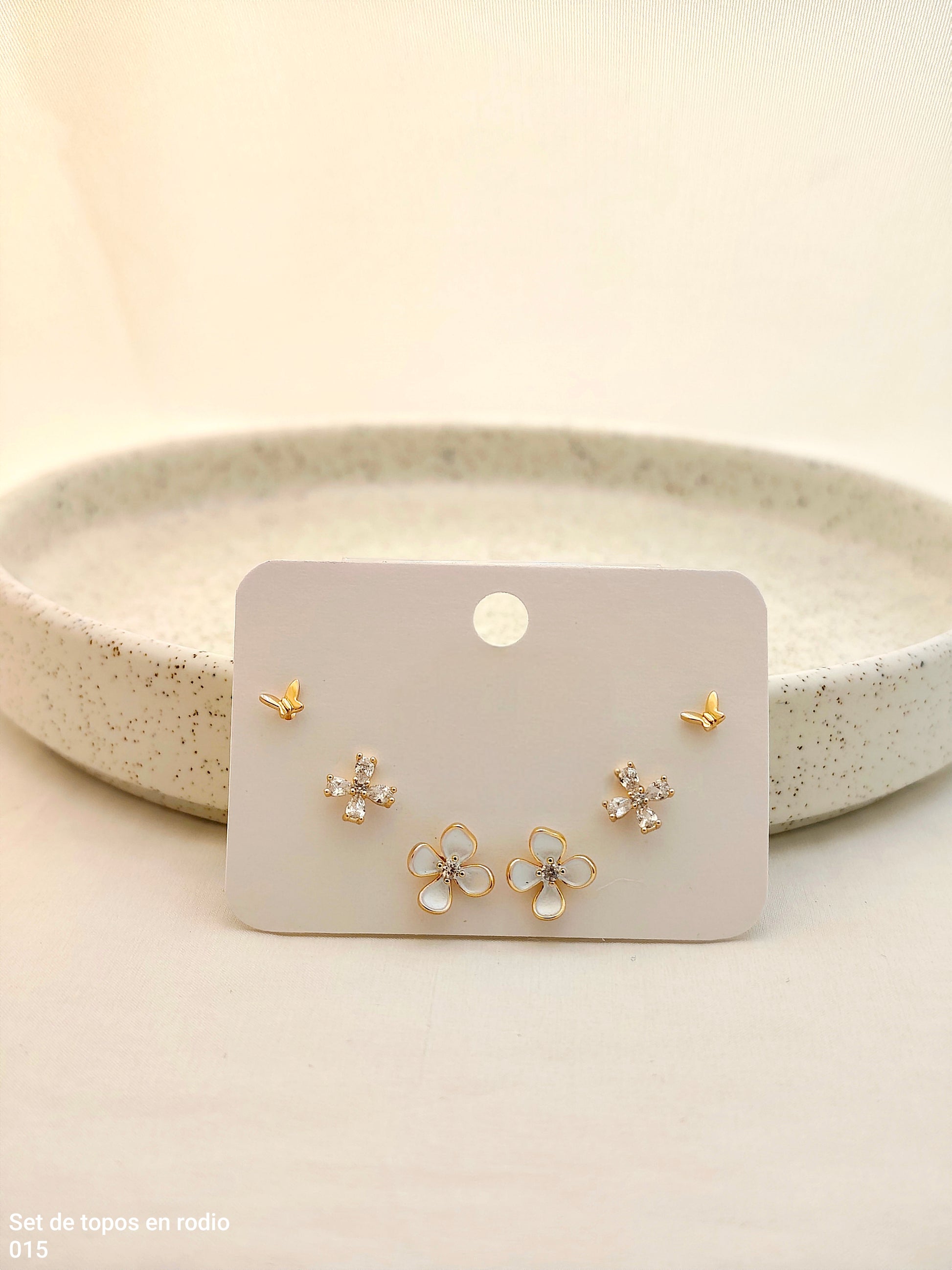 Set de topos con florecitas blancas, flores brillantes y mariposas doradas. Sutiles y encantadores, perfectos para dar un toque delicado a tu look. ✨🦋