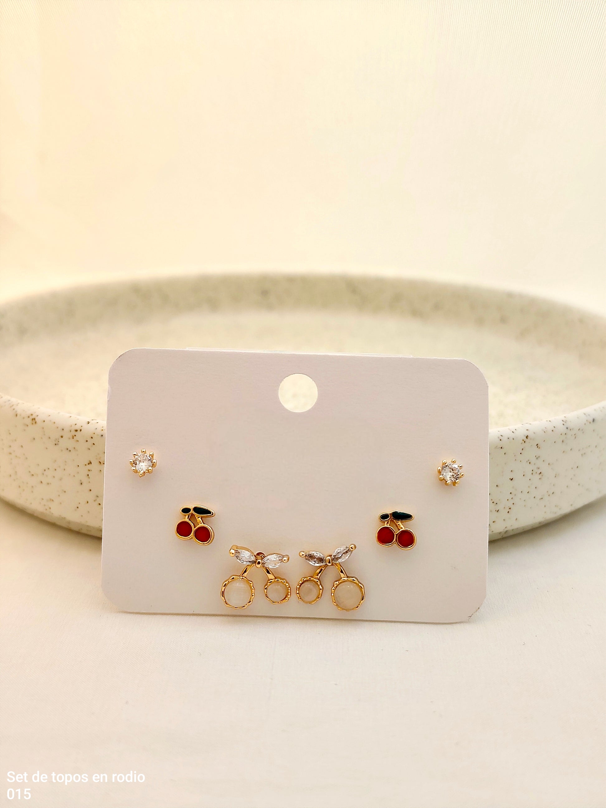 Set de topos en rodio con cerezas rojas, diseños dorado-plateado y topitos brillantes. Frescos y versátiles, ideales para sumar un toque divertido y chic a tu look. 🍒✨