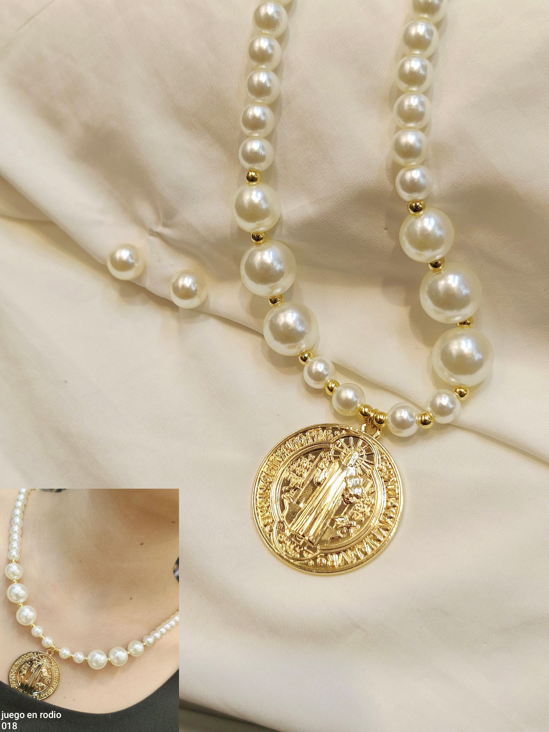 Un collar con medalla grande de San Benito, acompañado de perlas que le dan un toque vibrante, más topos a juego. Un diseño con estilo y significado que puedes llevar en cualquier ocasión.