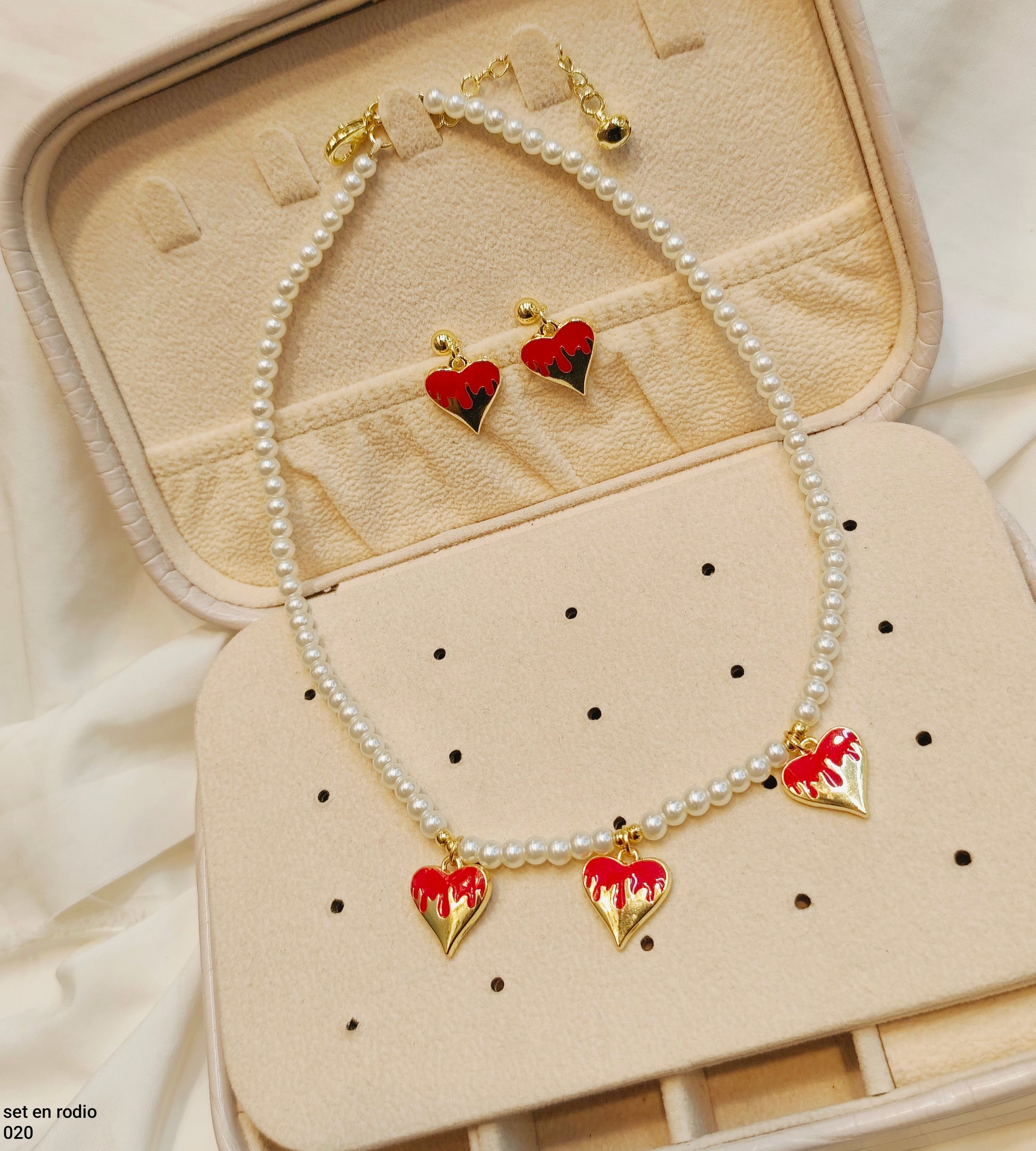 Un conjunto delicado y romántico que combina la elegancia de las perlas con el brillo del rodio. Sus dijes de corazones añaden un toque especial y lleno de encanto, perfecto para lucir en cualquier ocasión.