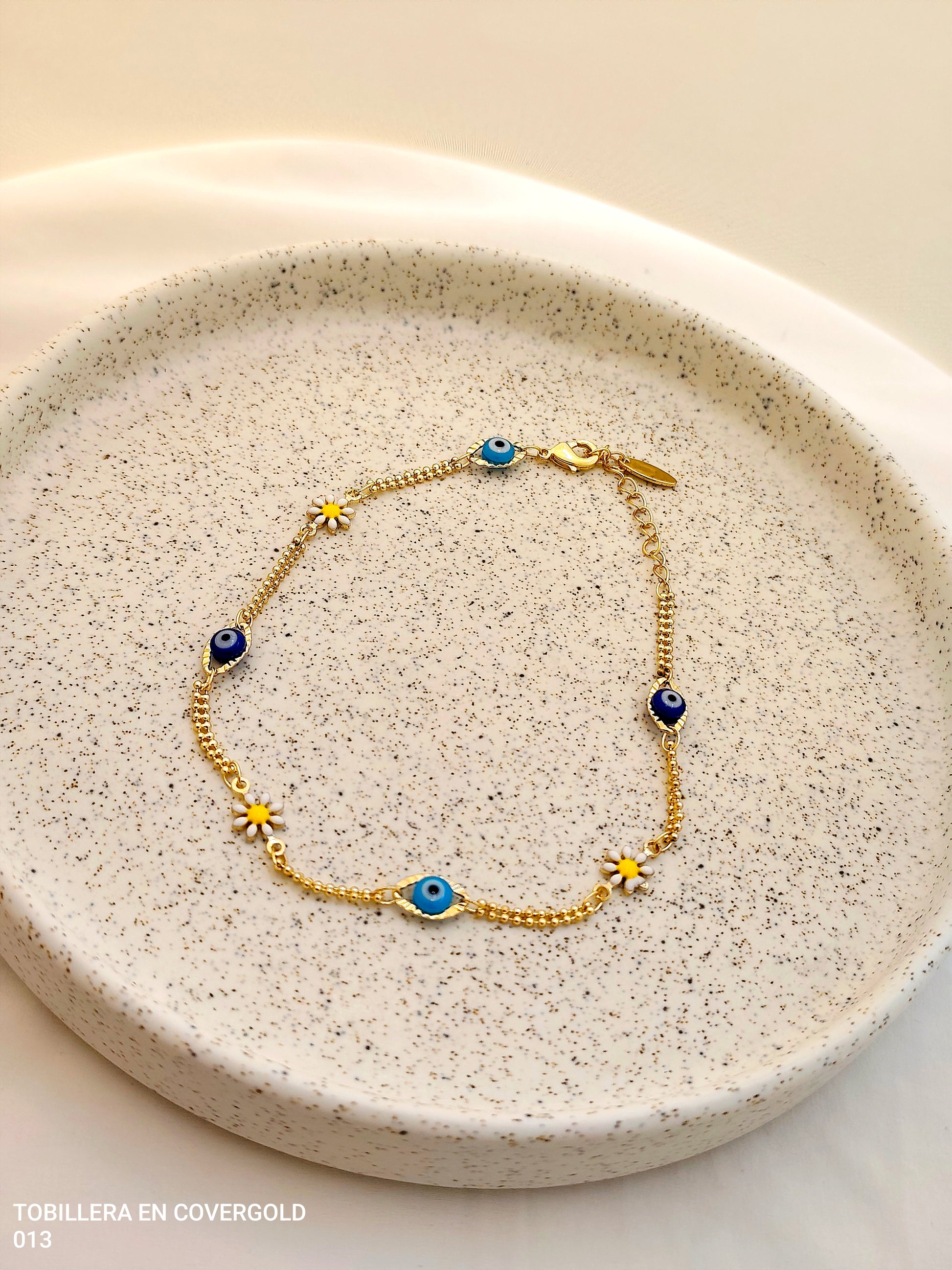 Tobillera en covergold dorada con florecitas y ojitos azules, un diseño encantador y colorido que aporta un toque juvenil y especial a cualquier look, perfecta para lucir en días soleados o escapadas casuales.