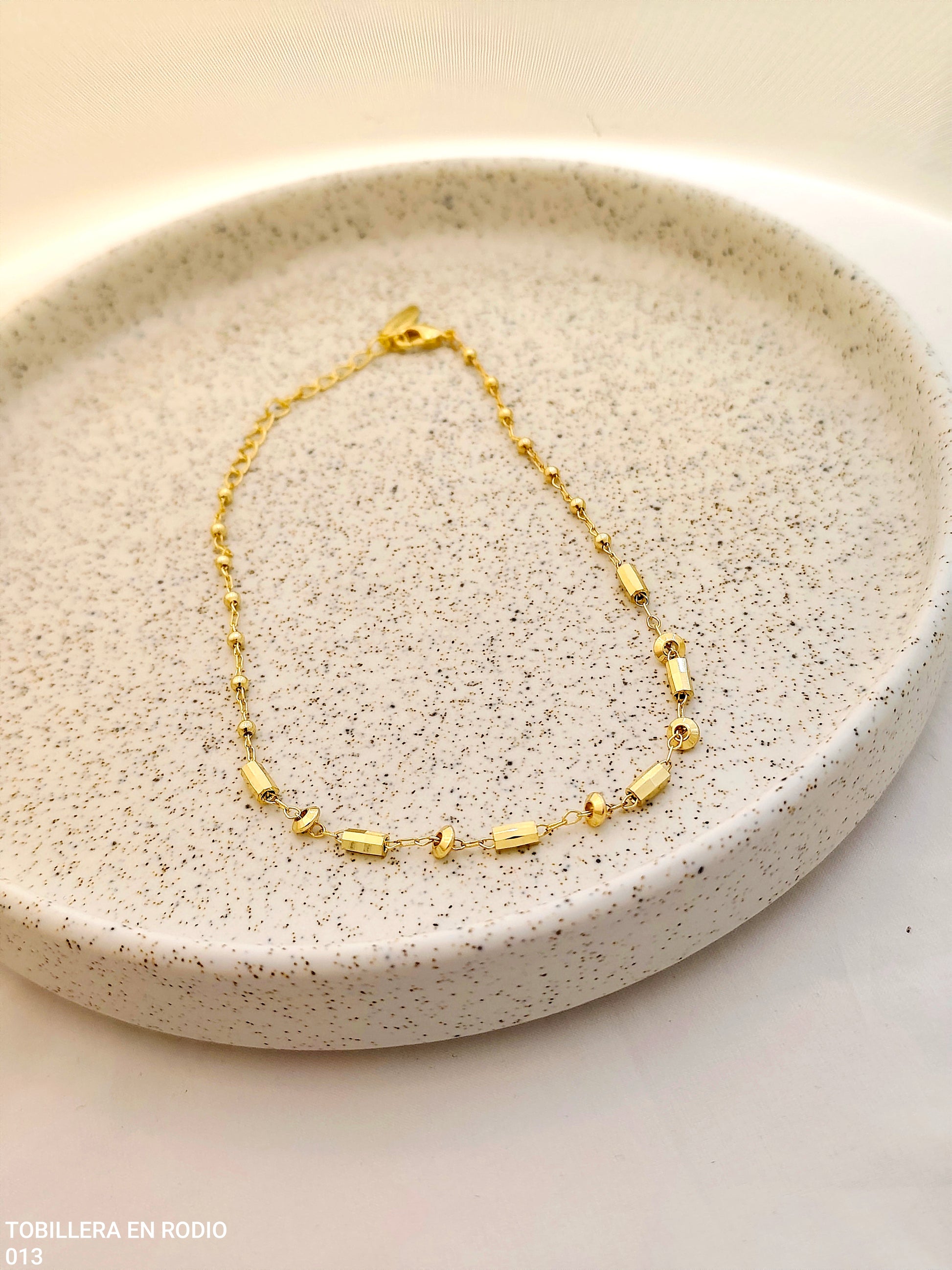Tobillera en rodio dorada y brillante, un accesorio elegante y versátil que aporta un toque de sofisticación y estilo a cualquier look.